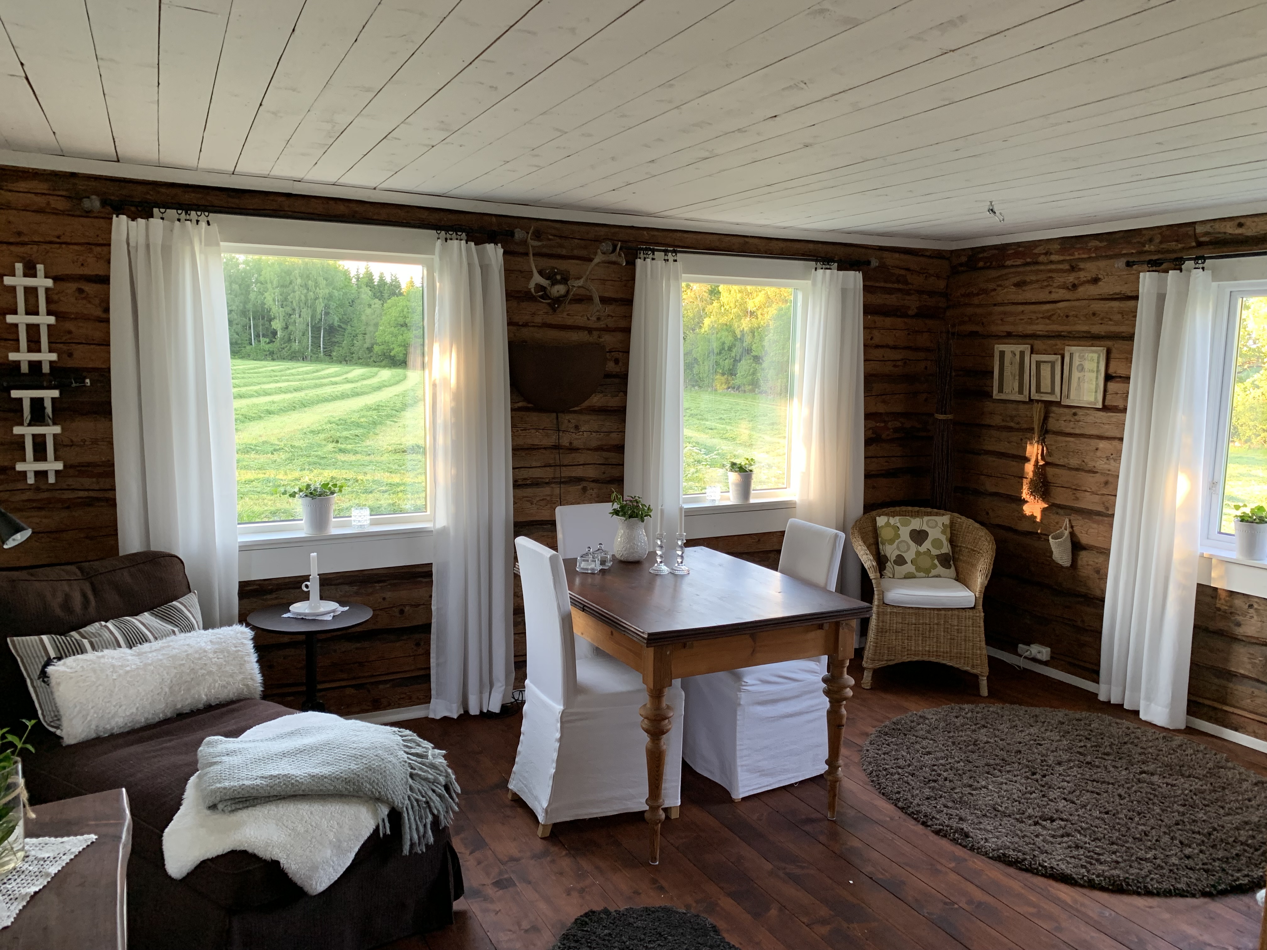 På gården har vi katt och höns. Från vår underbara trädgård som vätter mot ängen kan du både få se harar, tranor, rådjur och älgar.